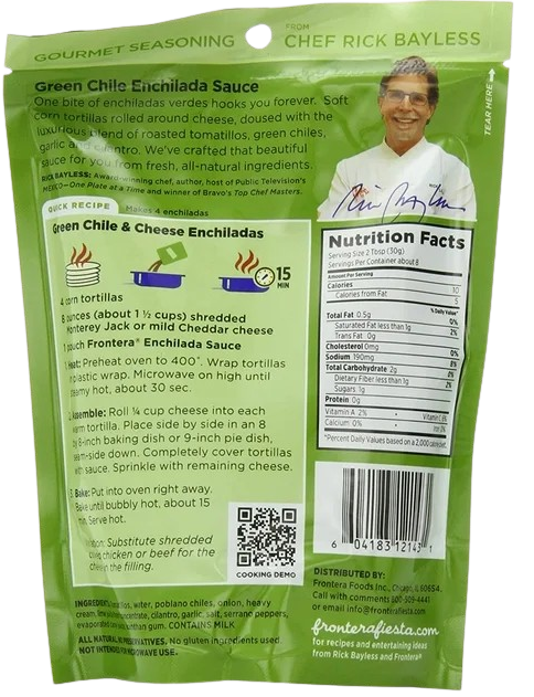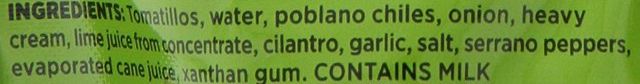 Ingredients: Tomatillos, Water, Poblano Chiles, Onion, Heavy Cream, Lime Juice from Concentrate, Cilantro, Garlic Salt, Serrano Peppers, Evaporated Cane Juice, Xanthan Gum, Contains Milk.All Natural. No Preservatives. No Gluten Ingredients Used.