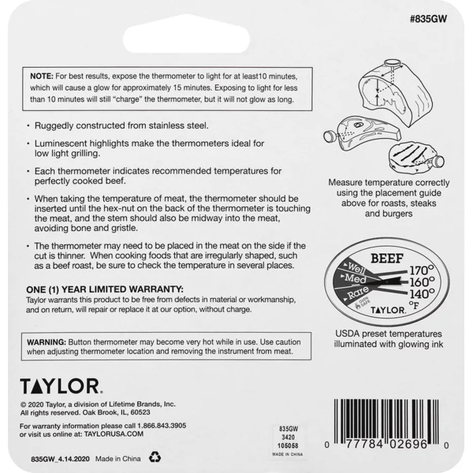 Taylor is a trusted name in kitchen and grilling tools, known for precision and reliability. The Taylor Grillworks Beef Grilling Button Thermometer Set makes it easy to cook burgers and steaks to your exact preference.