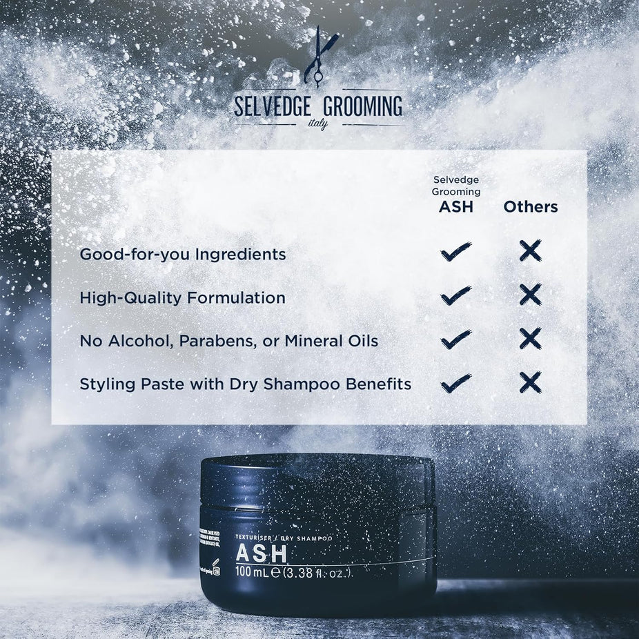 Elevate your grooming routine with Selvedge Grooming Ash Hair Texturizer and Dry Shampoo—perfect for modern men seeking a versatile, nourishing hair solution.
