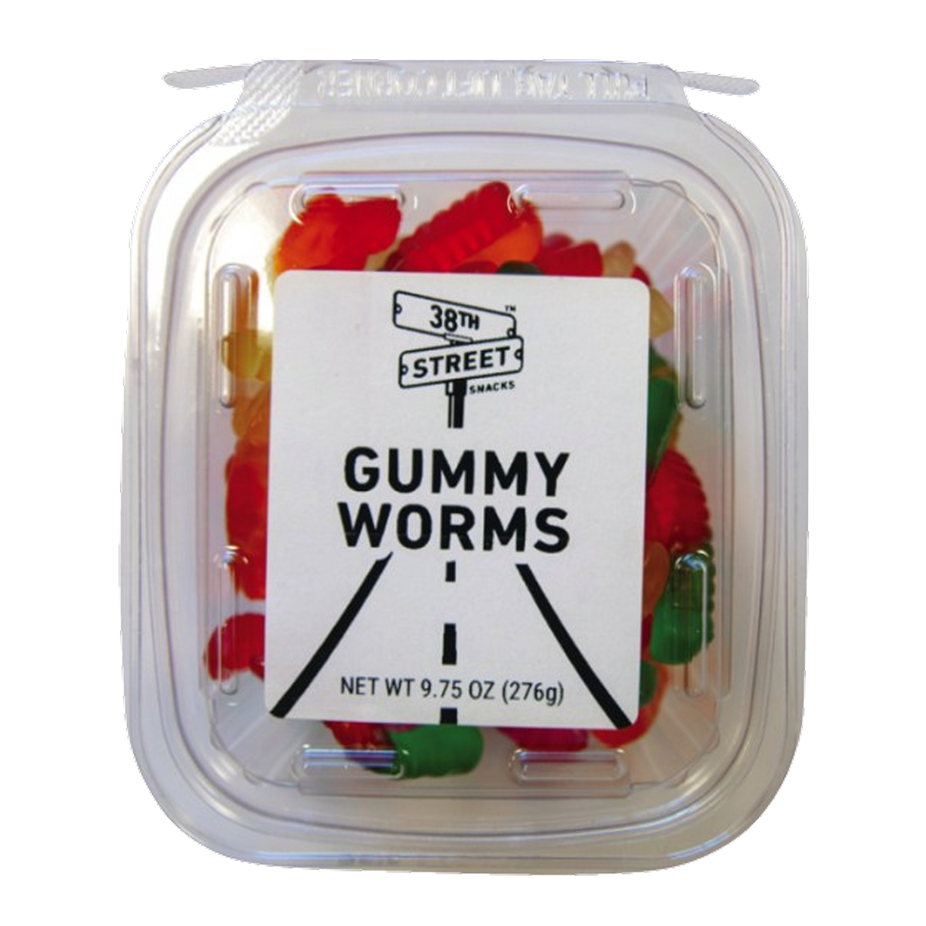 38th Street Gummy Worms Candy Tub is a playful mix of fruity gummies in charming butterfly shapes, perfect for sweet snacking or decorating desserts.