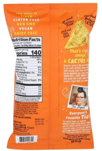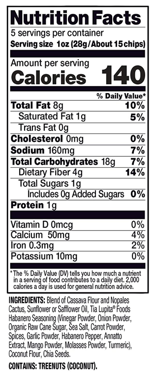 Ingredients: Blend Of Cassava Flour And Nopales Cactus, Sunflower Or Safflower Oil, Tia Lupita® Foods Habanero Seasoning (Vinegar Powder, Onion Powder, Organic Raw Cane Sugar, Sea Salt, Carrot Powder, Spices, Garlic Powder, Habanero Pepper, Annatto Extract, Mango Powder, Molasses Powder, Turmeric), Coconut Flour, Chia Seeds.