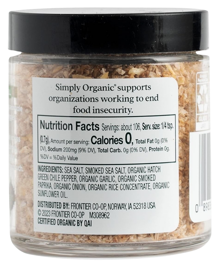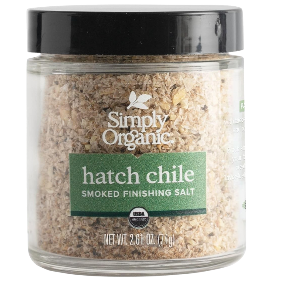 Simply Organic Hatch Chile Smoked Finishing Salt combines earthy hatch chile with savory herbs and smoked sea salt for a bold kick of Southwestern heat.-