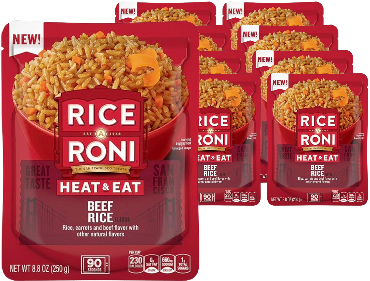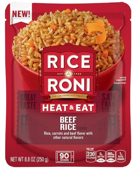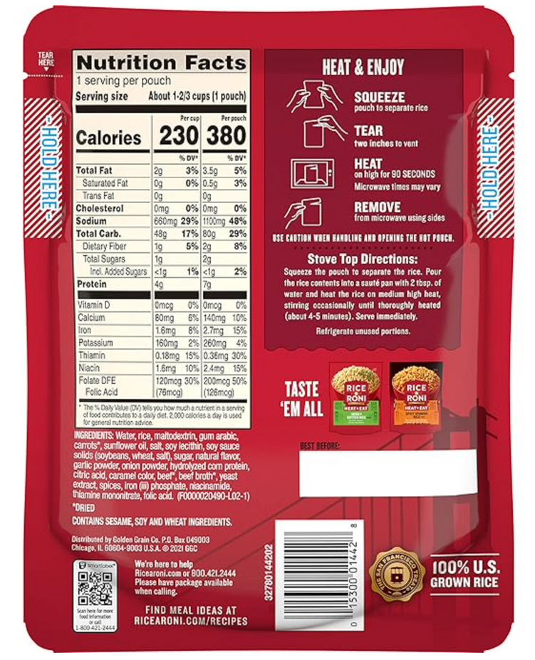 Ingredients: Water, Rice, Gum Arabic, Maltodextrin, Dried Carrots, Salt, Sunflower Oil, Soy Lecithin, Hydrolyzed Corn Protein, Potassium Salt, Soy Sauce Solids (Soybeans, Wheat, Salt), Sugar, Garlic Powder, Onion Powder, Natural Flavor (Contains Sesame), Dried Beef, Dried Beef Broth, Calcium Silicate, Caramel Color, Spices, Yeast Extract, Iron (iii) Phosphate, Niacinamide, Tocopherols (to Preserve Freshness), Thiamine Mononitrate, Folic Acid. Warnings Contains sesame, soy and wheat ingredients.