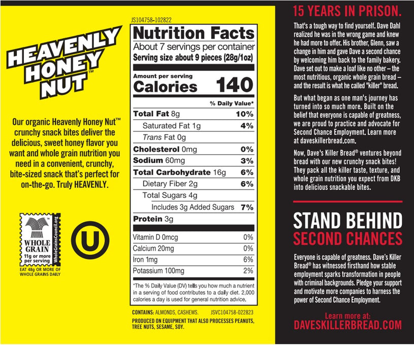 Dave’s Killer Bread’s Heavenly Honey Nut Crunchy Snack Bites deliver craveable crunch with a sweet blend of honey and nuts, perfect for snacking anytime, anywhere.