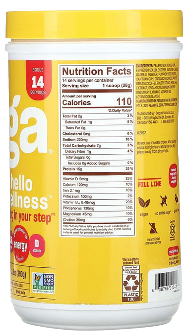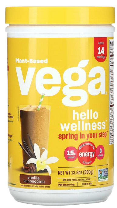 Every scoop of Vega Hello Wellness Spring in Your Step delivers 100mg caffeine (about the same as an 8oz cup of coffee!) to help you feel alert and energized. You’ll also get 15g of plant-based protein made from peas. Plus, it’s an excellent source of vitamin D—the sunshine vitamin. Mix up one scoop in 10 fl. oz of ice-cold water or non-dairy beverage using a shaker cup until fully dissolved (or, get creative and blend one scoop into your favorite smoothie). Spring in Your Step™ is offered in deliciously smooth Vanilla Cappuccino flavor. Spring in Your Step™ is Non-GMO Project certified, Vegan, B Corp certified, and gluten-free with no added sugar and no artificial preservatives.