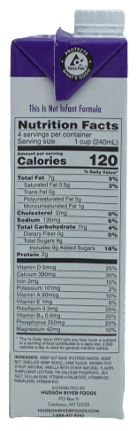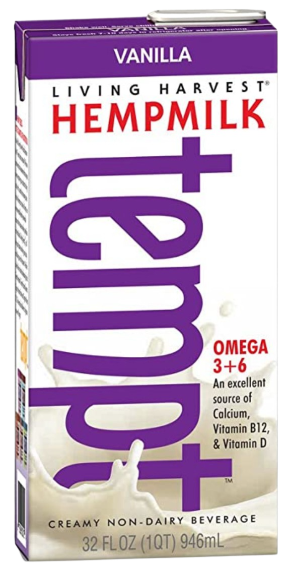 Ingredients: Hemp Nut Base (filtered Water, Hemp Nut [shelled Hemp Seed]), Pure Cane Sugar, Brown Rice Syrup, Vanilla Extract, Sunflower Lecithin, Tri-calcium Phosphate, Sea Salt, Gellan Gum, Vitamin A Palmitate, Vitamin D2, Riboflavin, Vitamin B12.