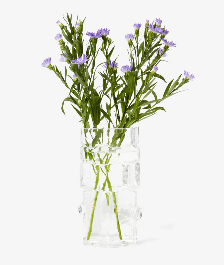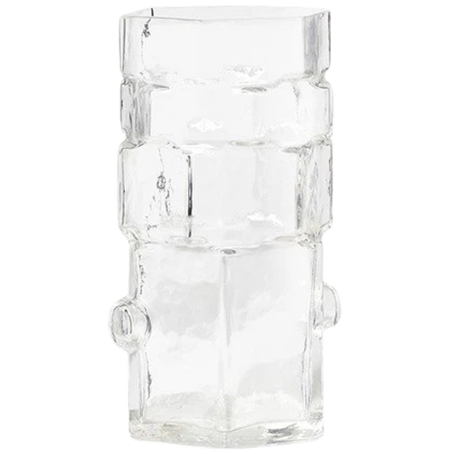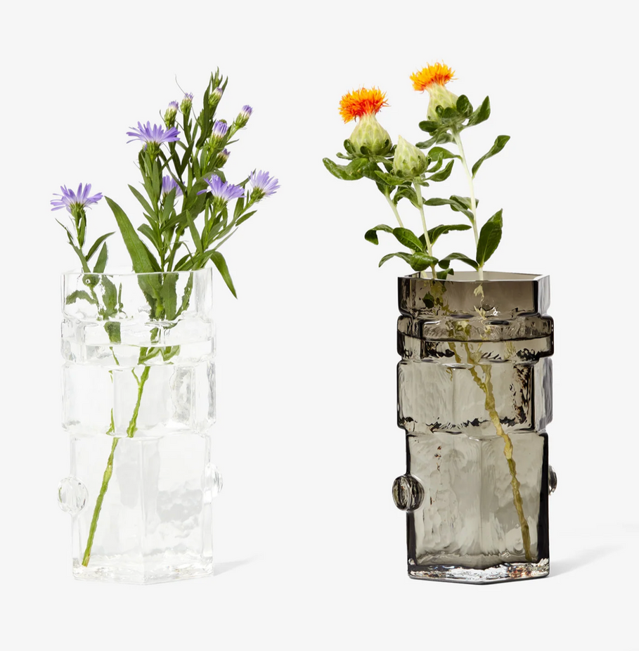 A geometric vase inspired by Brutalist design, featuring stacked hexagonal shapes, this piece mirrors notable elements of the designer's signature Hex planter series, adapted for the glass production of this collection of vases. The Hex Vase is the first BZIPPY design in glass, working exclusively without ceramic materials.