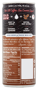 Natural, Healthier Energy. Smoother, Bolder Taste. Higher Caffeine Levels. Rich in Antioxidants. Lower Acidity. Better, Not Bitter. Cold Brew for Those Who Do. 90 Calories. Born From the Adventure of a Lifetime. We Created High Brew To Help You Navigate Anything The Day Throws Your Way. Premium Beans, Brewed Over Time, Not Heat. Gluten Free.
