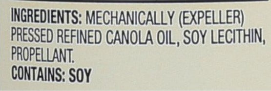 Ingredients: Mechanically (Expeller) Pressed Refined Canola Oil, Soy Lecithin, Propellant.