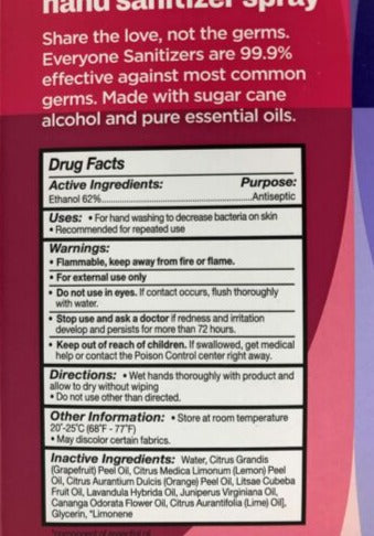 Ingredients: Water, Citrus Grandis (Grapfruit), Peel Oil, Citrus Medica Limonum (Lemon) Peel Oil, Citrus Aurantium Dulcis (Orange) Peel Oil, Litsae Cubeba Fruit Oil, Lavandula Hybrida Oil, Juniperus Virginiana Oil, Cananga Odorata Flower Oil, Citrus Aurantifolia (Lime) Oil, Glycerin, Limonene
