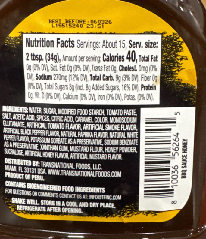 Ingredients: WATER, SUGAR, MODIFIED FOOD STARCH, TOMATO PASTE, SALT, ACETIC ACID, SPICES, CITRIC ACID, CARAMEL COLOR, MONOSODNUM GLUTAMATE, ARTIFICIAL TOMATO FLAVOR, ARTIFICIAL SMOKE FLAVOR, ARTICIAL BLACK PEPPER FLAVOR, NATURAL PAPRIKA FLAVOR, NATURAL WHITE PEPPER FLAVOR, POTASSUM SORBATE AS A PRESERVATIVE, SODIUM BENZOATE AS A PRESERVATIVE, XANTHAN GUM, MUSTARD FLOUR, HONEY POWDER, SUCRALOSE, ARTIFICIAL HONEY FLAVOR, ARTIFACIAL MUSTARD FLAVOR.