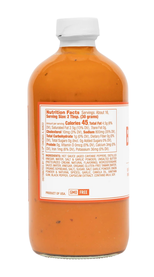 Ingredients: Hot Sauce (Aged Cayenne Peppers, Distilled Vinegar, Water, Salt & Garlic Powder), Unsalted Butter (Pasteurized Cream, Natural Flavoring), Worcestershire Sauce (Water, Vinegar, Organic Gluten-Free Tamari [Water, Organic Soybeans, Salt], Sugar, Salt, Garlic Powder, Onion Powder & Natural Spices), Garlic, Canola Oil, Xanthan Gum, Black Pepper, Capsicum Extract. Contains: Milk, Soy.
