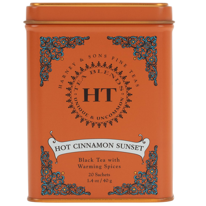 Harney & Sons Hot Cinnamon Sunset Black Tea offers a bold, warming flavor with black tea, three types of cinnamon, orange peel, and sweet cloves in convenient tea sachets.