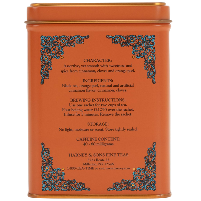 Ingredients: Black tea, orange peel, natural and artificial cinnamon flavor, cinnamon, cloves.