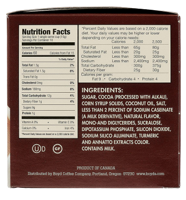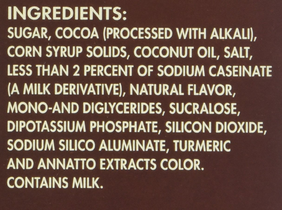 Ingredients: Sugar, Cocoa (Processed With Alkali), Corn Syrup Solids, Coconut Oil, Salt, Less Than 2 Percent Of Sodium Caseinate ( A Milk Derivative), Natural Flavor, Mono- And Diglycerides, Sucralose, Dipotassium Phosphate, Silicon Dioxide, Sodium Silico Aluminate, Turmeric And Annatto Extracts Color.