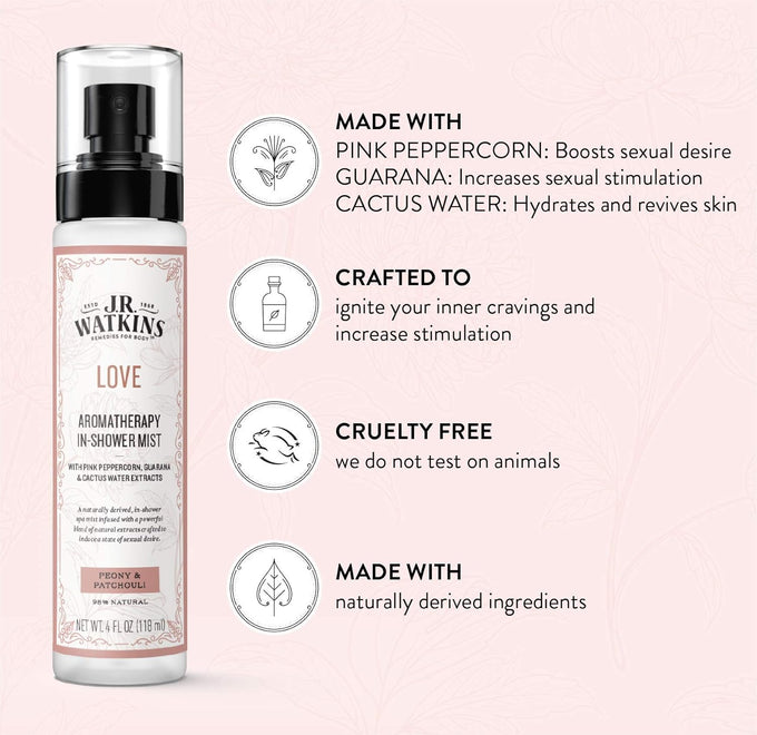 The J.R. Watkins In-Shower Mist Love transforms your daily shower into a rejuvenating spa-like escape, filled with invigorating botanicals and soothing aromatherapy.