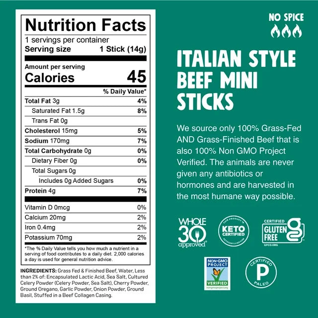 Ingredients: Grass Fed & Finished Beef, Water, Sea Salt, Encapsulated Lactic Acid, Cultured Celery Powder (Celery Powder, Sea Salt), Ground Oregano, Garlic Powder, Onion Powder, Ground Basil, Stuffed In A Beef Collagen Casing.