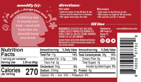 Dig in to a warm cup of gluten free oatmeal perfectly appointed with a dash of cinnamon, crunchy roasted almonds, pepitas and toasty coconut. Made with gluten free oats, ground flax seed, puffed amaranth, and date sugar.