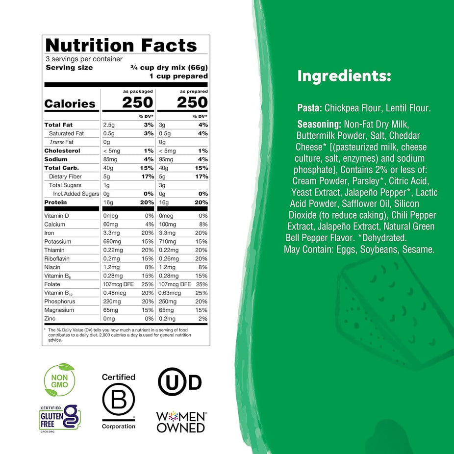 Ingredients: Pasta: Chickpea Flour, Lentil Flour. Seasoning: Non-fat Dry Milk, Buttermilk Powder, Salt, Cheddar Cheese” [(Pasteurized Milk, Cheese: Culture, Salt, Enzymes) And Sodium Phosphate], Contains 2% Or Less Of: Cream Powder, Parsley’, Citric Acid, Yeast Extract, Jalapefio Pepper’, Lactic Add Powder, Safflower Il, Silicon Dioxide (To Reduce Aking), Chili Pepper Extract, Jalapefio Extract, Natural Green Bell Pepper Flavor. Dehydrated. May Contain: Eqs, Soybeans, Sesame.