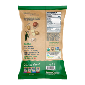 Ingredients: Organic Potatoes, Organic Sunflower And/Or Organic Safflower Oil, Organic Jalapeno Seasoning (Organic Brown Rice Flour, Organic Cane Sugar, Organic Onion, Sea Salt, Organic Green Bell Pepper, Organic Garlic, Organic Jalapeno Pepper, Organic Spices, Organic Yeast Extract, Organic Sunflower Oil, Natural Flavor).