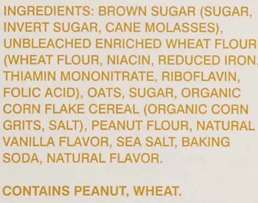 Ingredients: Brown Sugar (Sugar, Invert Sugar, Cane Molasses), Unbleached Enriched Wheat Flour (Wheat Flour, Niacin, Reduced Iron, Thiamin Mononitrate, Riboflavin, Folic Acid), Oats, Sugar, Organic Corn Flake Cereal (Organic Corn Grits, Salt), Peanut Flour, Natural Vanilla Flavor, Sea Salt, Baking Soda, Natural Flavor.