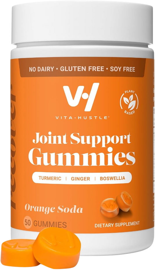 Elevate your joint health and recovery with VitaHustle Joint Support Gummies, featuring a powerful blend of turmeric, ginger, and boswellia in a delicious orange soda flavor.