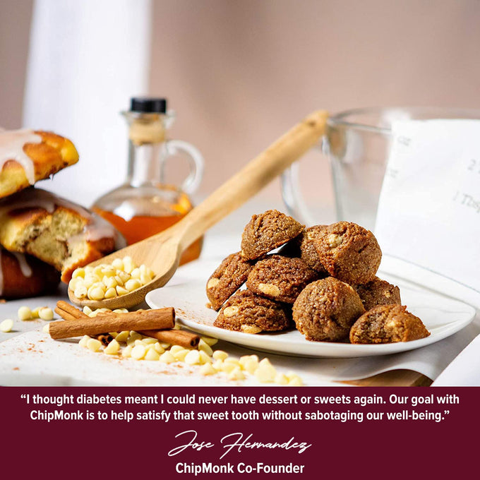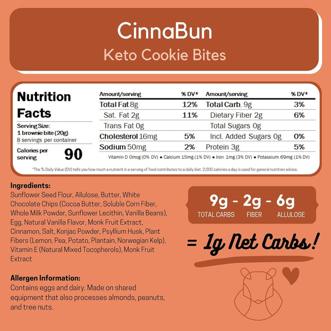 Ingredients: Sunflower Seed Flour, Allulose, Butter, White Chocolate Chips (Cocoa Butter, Soluble Corn Fiber, Whole Milk Powder, Sunflower Lecithin, Monk Fruit Extract, Vanilla Beans), Egg, Natural Vanilla Flavor, Monk Fruit Extract, Cinnamon, Salt, Konjac Powder, Psyllium Husk, Plant Fibers (Lemon, Pea, Potato, Plantain, Norwegian Kelp), Vitamin E (Natural Mixed Tocopherols).