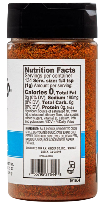 Ingredients: Salt, Paprika, Dehydrated Garlic, Dehydrated Onion, Cane Sugar, Citric Acid, Sun Flower Oil, Lemon Peel, Rice Concentrate, Paprica Extract