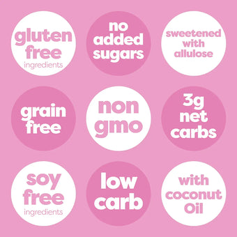 Ingredients: Dried Coconut, Sunflower Seeds, Almonds, Soluble Tapioca Fiber, Allulose, Pecans, Coconut Oil, Medium Chain Triglycerides, Dried Strawberries, Natural Vanilla Flavor, Salt, Monk Fruit Extract.