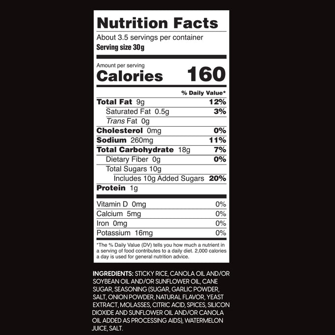 Ingredients: Sticky rice (glutinous rice, watermelon juice concentrate, sugar, salt), canola oil and/or soybean oil and/or sunflower oil, seasoning (sugar, garlic powder, salt, onion powder, natural flavor, yeast extract, molasses, citric acid, spices).