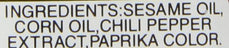 Ingredients: Sesame Oil, Corn Oil, Chili Pepper, Chili Pepper Extract, Paprika Color.