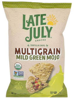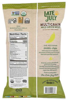Late July gives the classic snack, Tortilla Chips, a wholesome, organic spin. Tortilla chips made from a blend of seeds and whole grains like white corn, quinoa and brown rice, all with a creamy green chili lime flavor creates a flavorful, crunchy chip that pairs well with any dip. The wholesome Late July Multigrain Mild Green Mojo Tortilla Chips are featured right the bag, highlighting the simple ingredients.