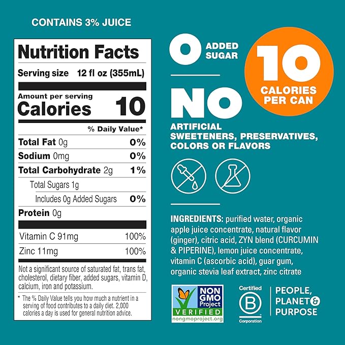 Ingredients: Purified water, organic apple juice concentrate, natural flavor (ginger), citric acid, ZYN blend (CURCUMIN & PIPERINE), lemon juice concentrate, vitamin C (ascorbic acid), guar gum, organic stevia leaf extract, zinc citrate