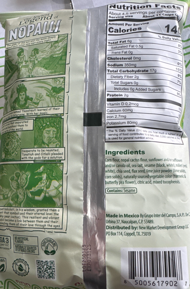 Ingredients: Corn flour, nopal cactus flour, sunflower and or sallower and/or canola oil, sea salt, sesame (black, white), millet (red, white), chia seed, flax seed, lime juice powder (lime solids, (corn solids), naturally sourced vegetable color (turmeric& butterfly pea flower), citric acid, mixed tocopherols.