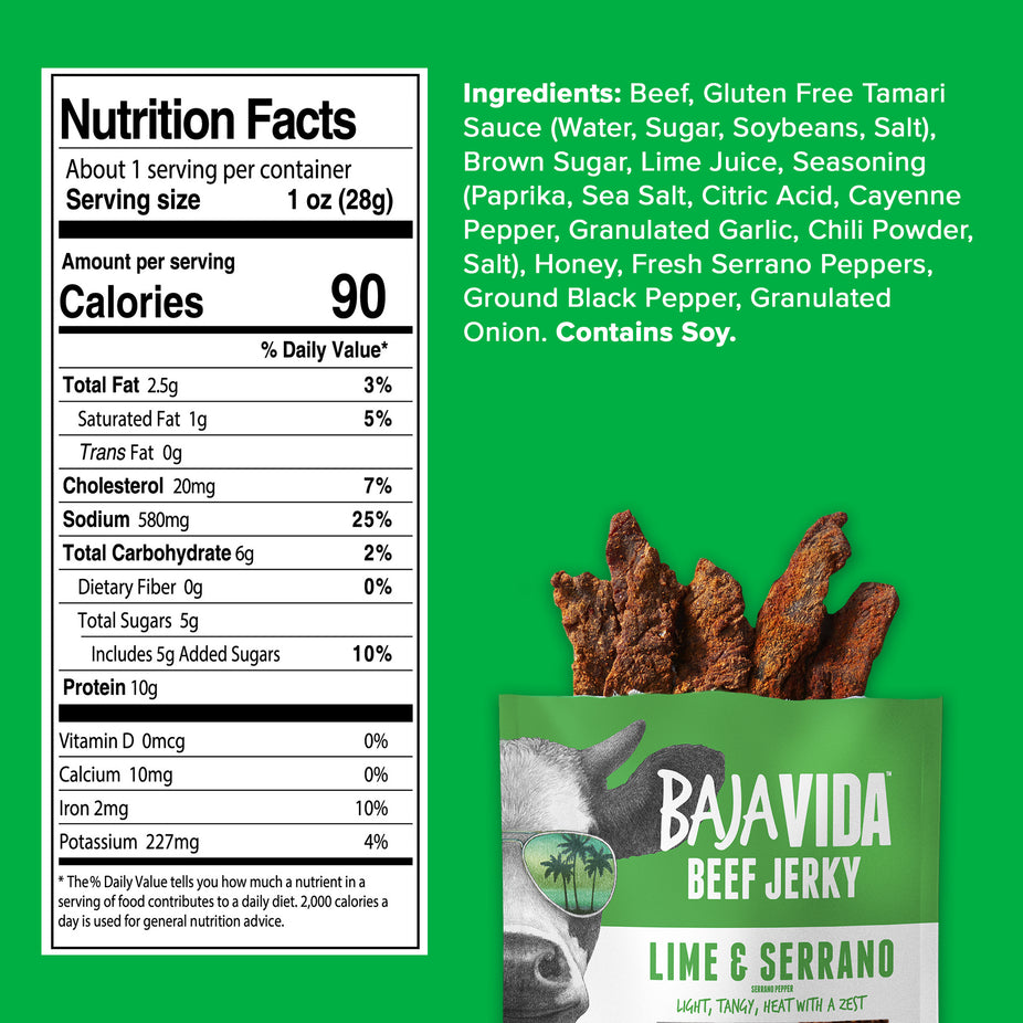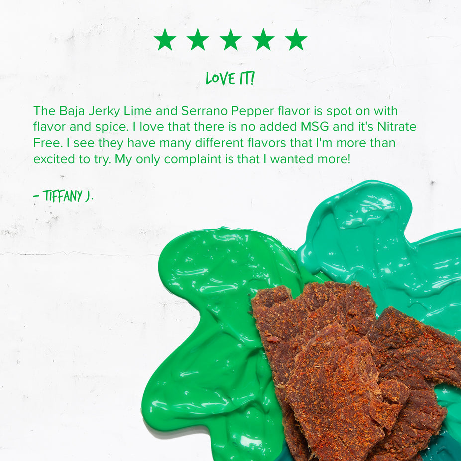 Baja Vida Lime & Serrano Pepper Beef Jerky delivers the perfect balance of fiery heat and zesty lime in a mouthwatering, tender jerky.