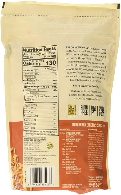 Ingredients: Total Fat 1G 2%, Saturated Fat 1G 1%, Trans Fat 0G, Cholesterol 0Mg 0%, Sodium 0Mg 0%, Potassium 80Mg 2%, Total Carbohydrate 27G 9%, Dietary Fiber 1G 5% , Sugars 0G, Protein 3G, Vitamin A 0%, Vitamin C 0%,Cala C 0Cium 0%,Iron 4%,Thiamine 10%,Riboflavin 2%,Niacin 8%,Ingredients:,Organic Brown Rice Flour, Certified Organic By Quality Assurance International (Qai),Packaged In Hereford, Texas