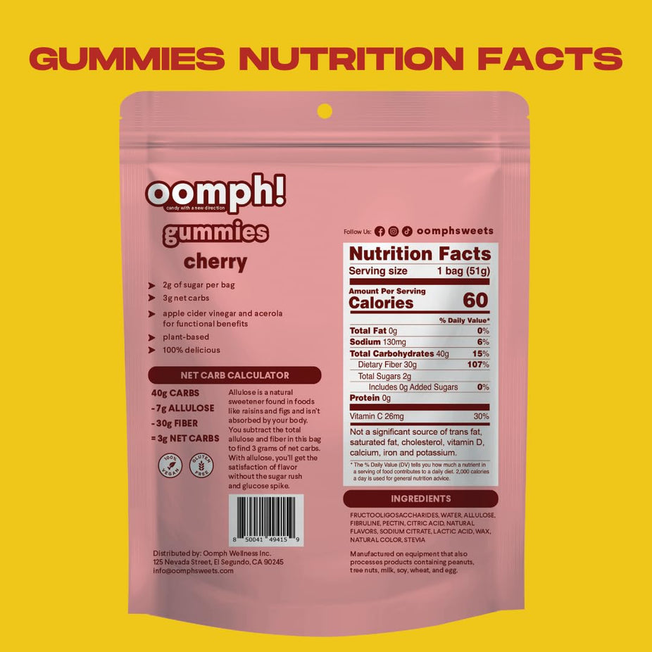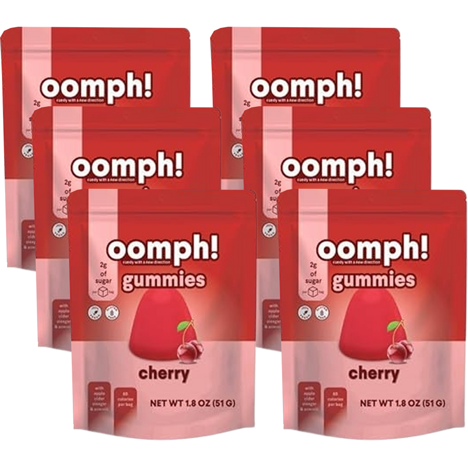 Oomph is a wellness-focused brand reinventing candy with functional benefits and clean ingredients for everyday gut health. The Low-Calorie Gummies - Cherry (6 pack) deliver a delicious dose of fiber in a fruity, feel-good treat you can enjoy without guilt.