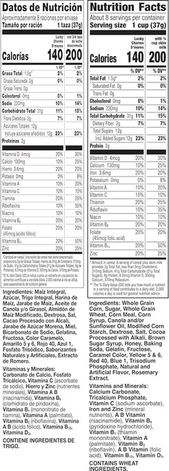 Ingredients: Whole Grain Corn, Sugar, Whole Grain Wheat, Corn Meal, Corn Syrup, Canola and/or Sunflower Oil, Modified Corn Starch, Dextrose, Salt, Cocoa Processed with Alkali, Brown Sugar Syrup, Honey, Baking Soda, Gelatin, Fructose, Caramel Color, Yellow 5 & 6, Red 40, Blue 1, Trisodium Phosphate, Natural and Artificial Flavor, Rosemary Extract. Vitamins and Minerals: Calcium Carbonate. Tricalcium Phosphate, Vitamin C (sodium ascorbate), Iron and Zinc (mineral nutrients), A B Vitamin (niacinamide), Vitamin B6 (pyridoxine hydrochloride), Vitamin B, (thiamin mononitrate), Vitamin A (palmitate), Vitamin B2 (riboflavin), A B Vitamin (folic acid), Vitamin B12, Vitamin D3. CONTAINS WHEAT