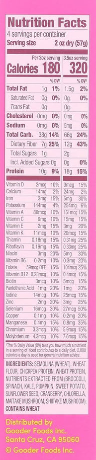 Ingredients: Semolina (Wheat), Wheat Flour, Chickpea Protein, Wheat Protein, Nutrients Extracted From (Broccoli, Spinach, Kale, Pumpkin, Sweet Potato, Sunflower Seed, Cranberry, Chlorella, Maitake Mushroom, Shiitake Mushroom.