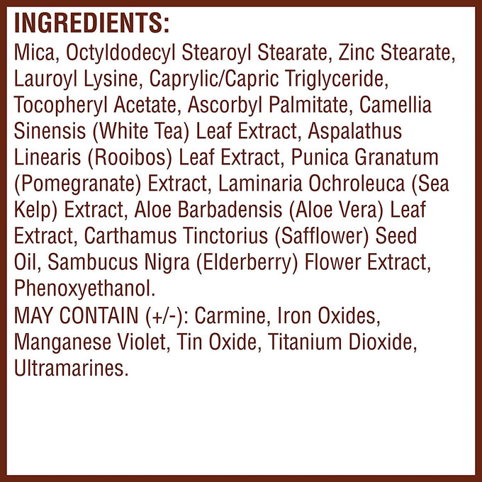 Ingredients: Mica, Octyldodecyl Stearoyl Stearate, Zinc Stearate, Lauroyl Lysine, Caprylic/Capric Triglyceride, Tocopheryl Acetate, Ascorbyl Palmitate, Camellia Sinensis (White Tea) Leaf Extract, Aspalathus Linearis (Rooibos) Leaf Extract, Punica Granatum (Pomegranate) Extract, Laminaria Ochroleuca (Sea Kelp) Extract, Aloe Barbadensis (Aloe Vera) Leaf Extract, Carthamus Tinctorius (Safflower) Seed Oil, Sambucus Nigra (Elderberry) Flower Extract, Phenoxyethanol. MAY CONTAIN (+/-): Carmine, Iron Oxides, Manganese Violet, Tin Oxide, Titanium Dioxide, Ultramarines.