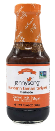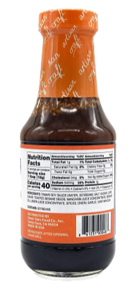 Ingredients: Tamari Soy Sauce (Water, Soybeans, Salt, Sugar), Cane Sugar, Toasted Sesame Seeds, Mandarin Juice Concentrate, Sesame Oil, Lemon Juice Concentrate, Spices, Onion, Garlic, Xanthan Gum.