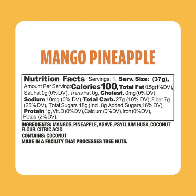 Ingredients: Mangos, Pineapple, Agave, Psyllium Husk, Coconut Flour, Citric Acid.