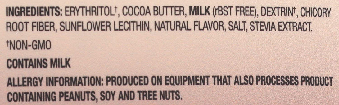 Ingredients: Erythritol, Cocoa Butter, Milk, Dextrin, Chicory Root Fiber, Natural Flavours, Color, Sunflower Lecithin, Salt, Stevia Extract