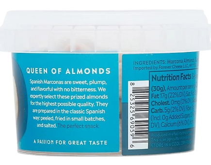 Queen of almonds. Spanish Marconas are sweet, plump, and flavorful with no bitterness. We expertly select these prized almonds for the highest possible quality. They are prepared in the classic Spanish way: peeled fried in small batches, and salted. The perfect snack. A passion for great taste. Food safe.Product of Spain.