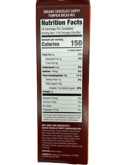 Ingredients: Organic Chocolate Chippy Pumpkin Bread Mix: Organic Cane Sugar, Organic Identity Preserved Wheat Flour, Organic Chocolate Chips (Organic Cane Sugar, Organic Cocoa Liquor, Organic Cocoa Butter), Organic Brown Sugar, Organic Pumpkin Powder, Organic Spices, Organic Sunflower Oil, Leavening (Sodium Acid Pyrophosphate, Sodium Bicarbonate, Monocalcium Phosphate), Sea Salt, Organic Corn Starch, Organic Vanilla Extractives.