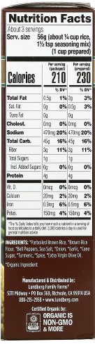 Ingredients: *Parboiled Brown Rice, *Brown Rice Flour, *Bell Peppers, Sea Salt, *Onion, *Garlic, *Cane Sugar, *Turmeric, *Spice, *Extra Virgin Olive Oil.