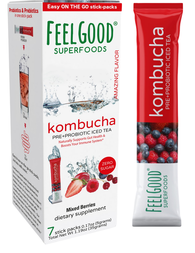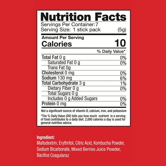 Ingredients: Maltodextrin, Erythritol, Citric Acid, Kombucha Powder, Sodium Bicarbonate, Micex Berries Juice Powder, Bacillus Coagulansz.