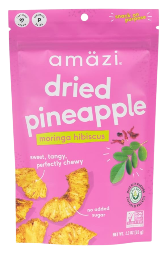 Amazi Moringa Hibiscus Dried Pineapple is a vibrant and chewy tropical treat with a unique superfood twist.