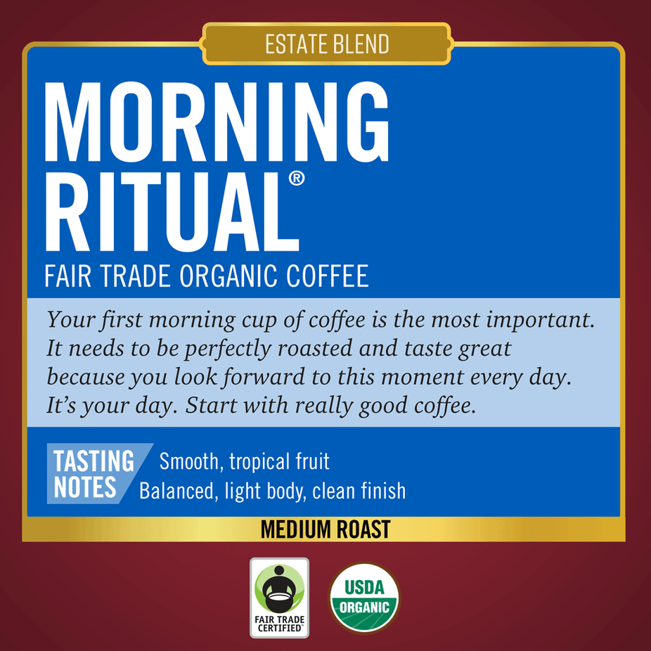 What’s your Morning Ritual? We think your first morning cup of coffee is the most important. It needs to be perfectly roasted and taste great because you look forward to this moment every day. It's your day. Start with really good coffee. Our Morning Ritual blend is a premium take on our classic Breakfast Blend. We tasked our roast masters to use what they have learned and develop a more refined, even better tasting Fair Trade Organic blend, perfectly suited for your first cup in the morning. That is our Morning Ritual, now it can become yours.