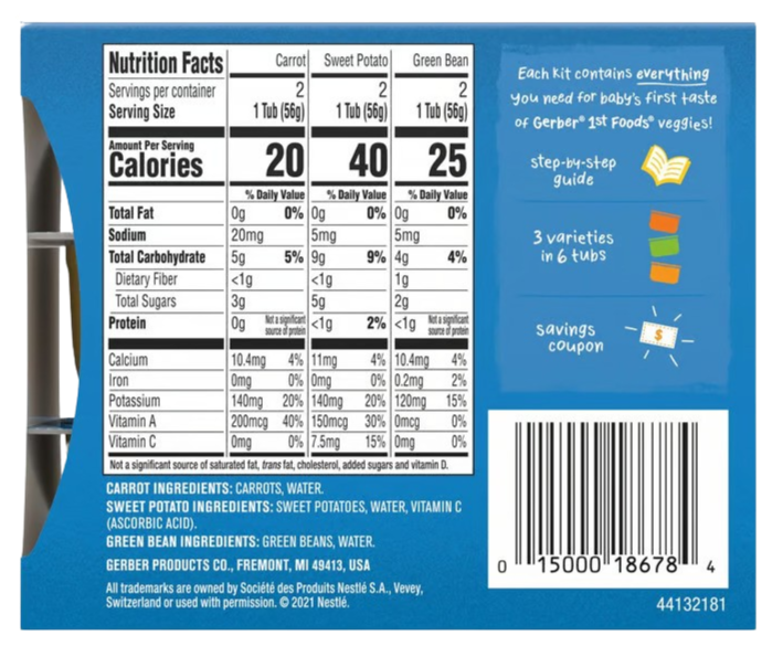 Ingredients: Carrot Ingredients: Carrots, water. Sweet Potato Ingredients: Sweet potatoes, water, vitamin C (ascorbic acid). Green Bean Ingredients: Green beans, water.